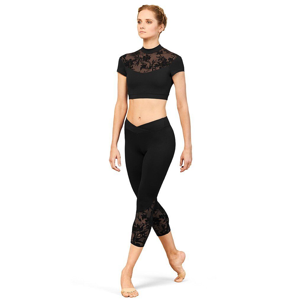 Inject your dance wardrobe with style and function, this legging has a 7/8 length and a V front waistband to have you completely comfortable and ready to move. The lower leg showcases a luxe floral mesh that is featured throughout the collection. A staple piece this season that can be paired with your favourite basic or any top from the collection for matching trim and an effortless outfit.