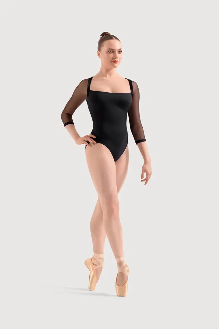 Captivate in the studio and on stage with the spellbinding Mamselle Leotard. The 3/4 mesh sleeves add sophistication, complementing the straight neckline with luxurious velvet trim. The look is enhanced with an exquisite open-back detail, accentuating your lines and silhouette. Fully front lined with a high-cut leg, the Mamselle Leotard ensures a flattering and superior fit.