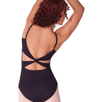 Stand out from the rest in the Camisole Leotard with Twist Back. This leotard stretches and twists like a dream. It features a self-fabric shelf bra for added support during every movement and a scoop front neckline and twist-back detail that will make you feel like a superstar on stage. The front empire seam adds a touch of glamour, while the moderate leg line keeps everything in place during your performance.
