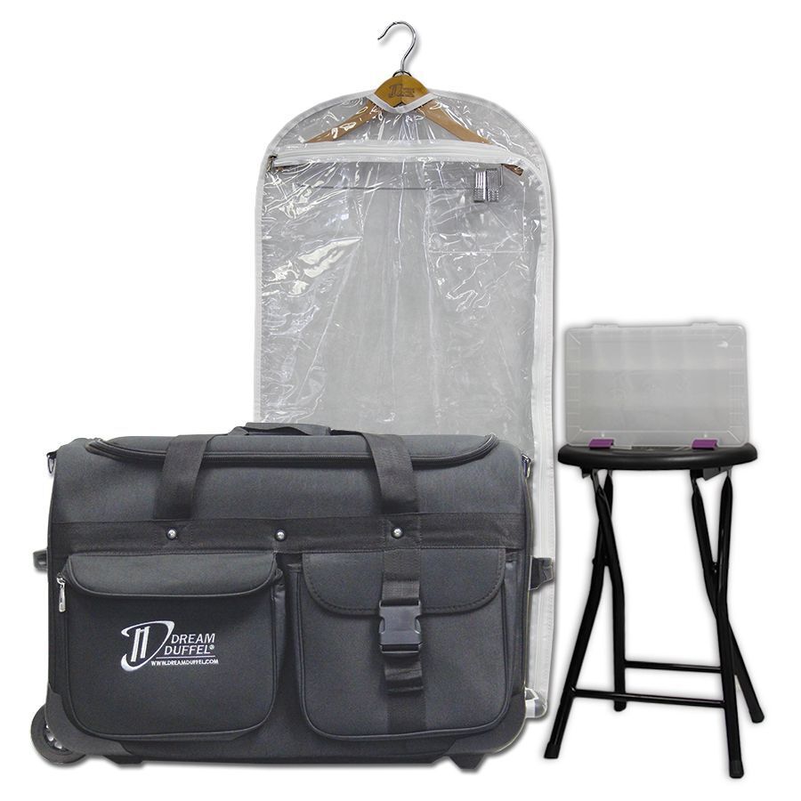 Are you looking for the ULTIMATE dance bag for dance competitions? You’ve found it! The Dancer’s Dream Duffel. Our rolling dance bag is an essential addition to any dance competition — with everything from a Patent Pending one-touch telescoping costume rack, garment bag and accessory box, to a folding stool! You get smart, convenient storage and a handy competition garment rack all in one.