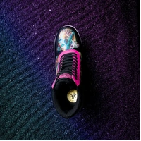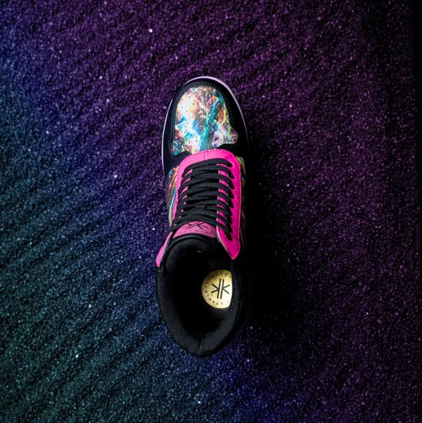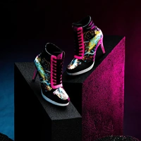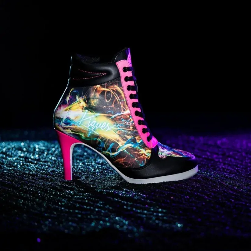 A send-up to 80s high top sneaker culture, Electrika Kiques are made for the thrill seekers. Featuring bright neon panels along the sides, a striking electric pink colour block on the front panels and heel these heels are designed to make an entrance.