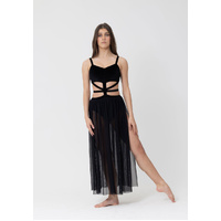 The lightweight mesh skirt flows beautifully with every movement, and dramatic side splits add just the right touch of flair—perfect for showcasing turns, leaps, and floor work. Whether you’re performing lyrical, contemporary, or modern routines, this dress combines comfort, style, and stage-worthy drama in one unforgettable look.