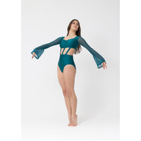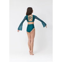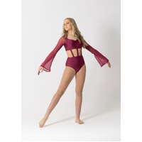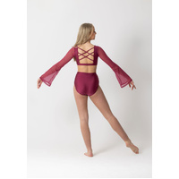 Step into the spotlight with elegance and strength in the Isobel Leotard. Designed for lyrical and contemporary dancers, this striking piece blends drama and sophistication with effortless wearability. The flowing bell sleeves create a sense of movement with every gesture, while the daring bare midriff adds modern edge. A corset-inspired strap detail frames the bodice, giving this leotard a structured, fashion-forward finish. The criss cross straps at the back finish this visually mesmerising dance costume.