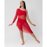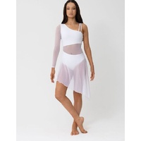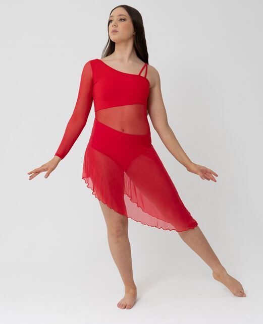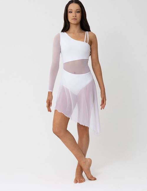A single long mesh sleeve offers graceful coverage on one arm, while the opposite side showcases an elegant double-strap detail. The asymmetry continues through the skirt, where soft mesh drapes diagonally for beautiful movement that mirrors your choreography.