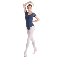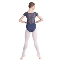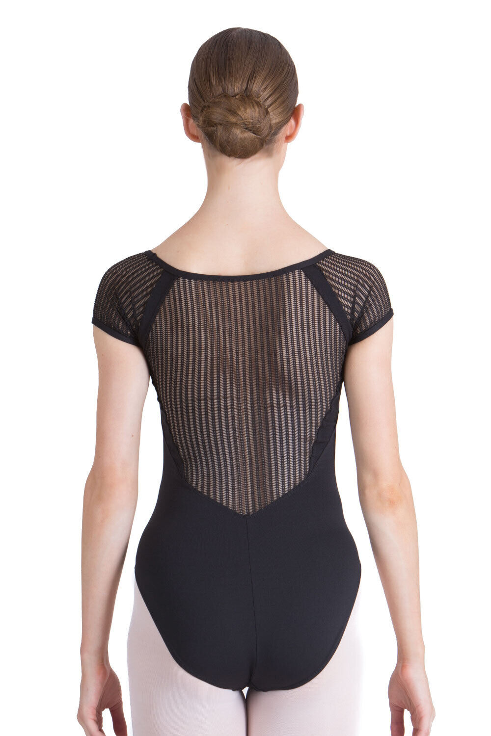Linked mesh back and cap sleeves, with v-neck front.